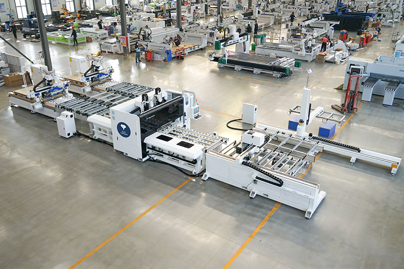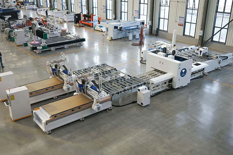 一拖二貼標(biāo)鉆切單元是一套自動(dòng)化程度比較高的數(shù)控開(kāi)料解決方案。由三工位龍門(mén)上料、自動(dòng)貼標(biāo)機(jī)、雙鉆包六面鉆、兩臺(tái)全自動(dòng)數(shù)控開(kāi)料機(jī)以及動(dòng)力滾筒線(xiàn)、中控系統(tǒng)組成??蓪?shí)現(xiàn)自動(dòng)上料、自動(dòng)貼標(biāo)、上下孔槽及切割加工。是一種自動(dòng)化程度高,效率高、性?xún)r(jià)比高的板式家具自動(dòng)化生產(chǎn)方案。