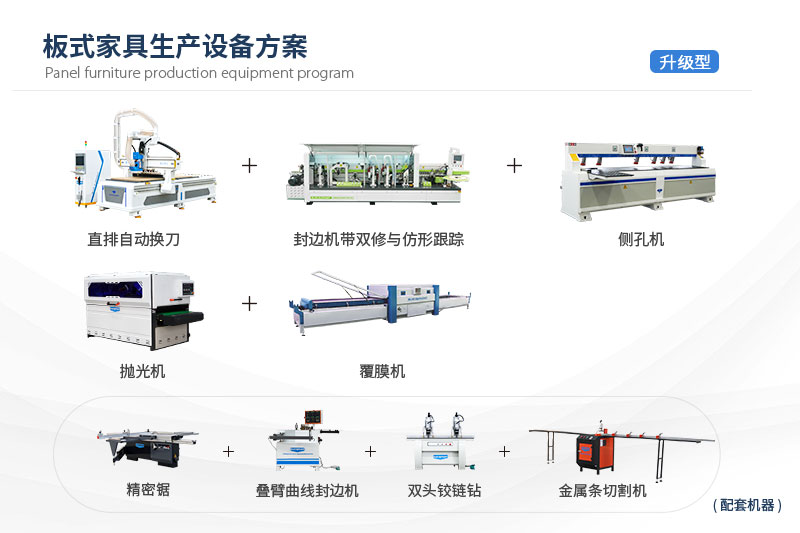 ?升級(jí)型-板式家具生產(chǎn)設(shè)備方案柜體/柜門(吸塑/平板)生產(chǎn)解決方案主要由直排換刀加工中心、封邊機(jī)、側(cè)孔機(jī)、拋光機(jī)、覆膜機(jī)、精密鋸、疊臂封邊機(jī)、雙主軸鉸鏈鉆、金屬條切割機(jī)組成,可滿足全屋定制廠家的生產(chǎn)加工,機(jī)器