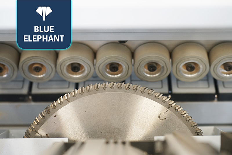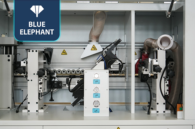 該設(shè)備采用45°斜邊鋸,使直板進(jìn)入板材進(jìn)行切割銑型成45°斜邊,通過斜直膠鍋和斜直一體壓貼,使封邊帶與斜直邊板材粘合更緊密。